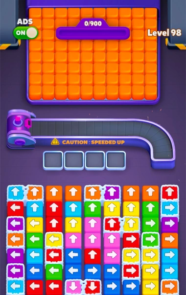 Tap to clear the paths of colorful blocks that have directional arrows. Blocks travel to the conveyor belt after being unblocked, where they fire at target blocks of the same color.