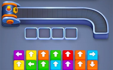 Tap to clear the paths of colorful blocks that have directional arrows. Blocks travel to the conveyor belt after being unblocked, where they fire at target blocks of the same color.