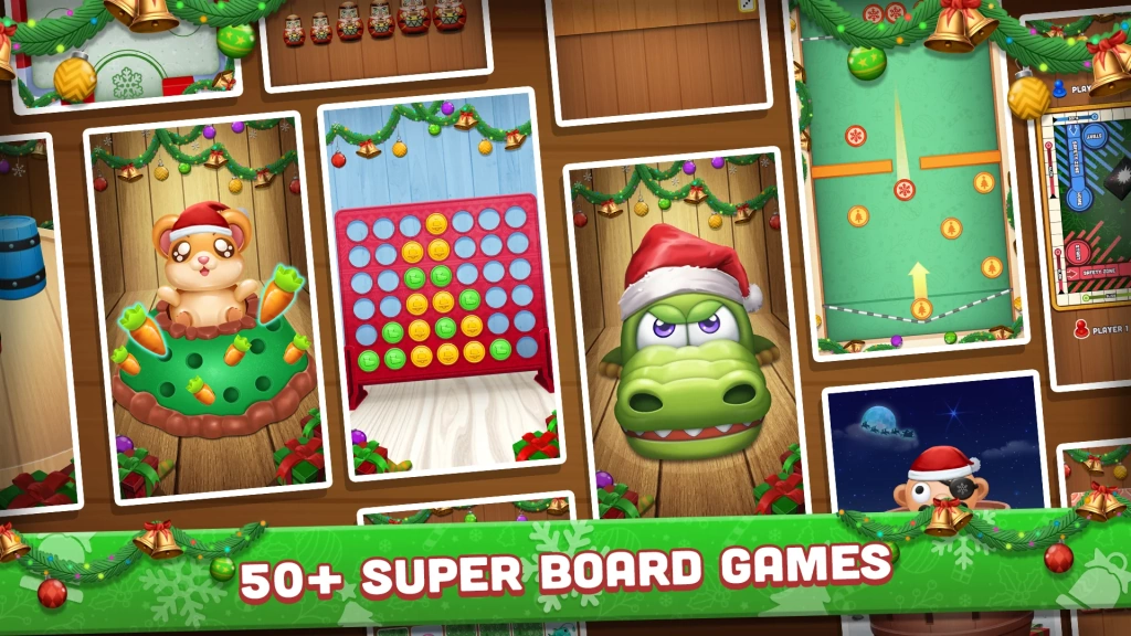 Board game collection: Crocodile Tooth Doctor, Connect 4 In A Row, Ladders & Snakes, Penguin Memory, Capybara Pop It, Tic Tac Toe XO, Soccer Game, Shut The Box, Pirate Pop, Sea Battle and many more.
