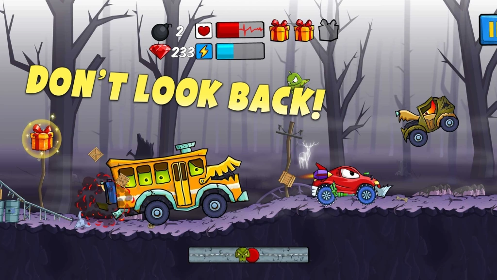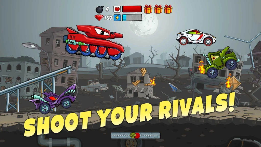 Either put your foot down and outrun your opponents, collect upgrades, or shoot them. Jumping and pulling off insane stunts on the hills will earn you bonus points.