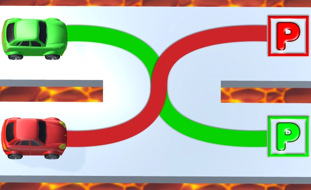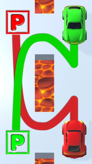 A car parking puzzle simulation. Use tapping and line-drawing to maneuver through congested parking lots. Plan your moves carefully because collisions result in a restart.
