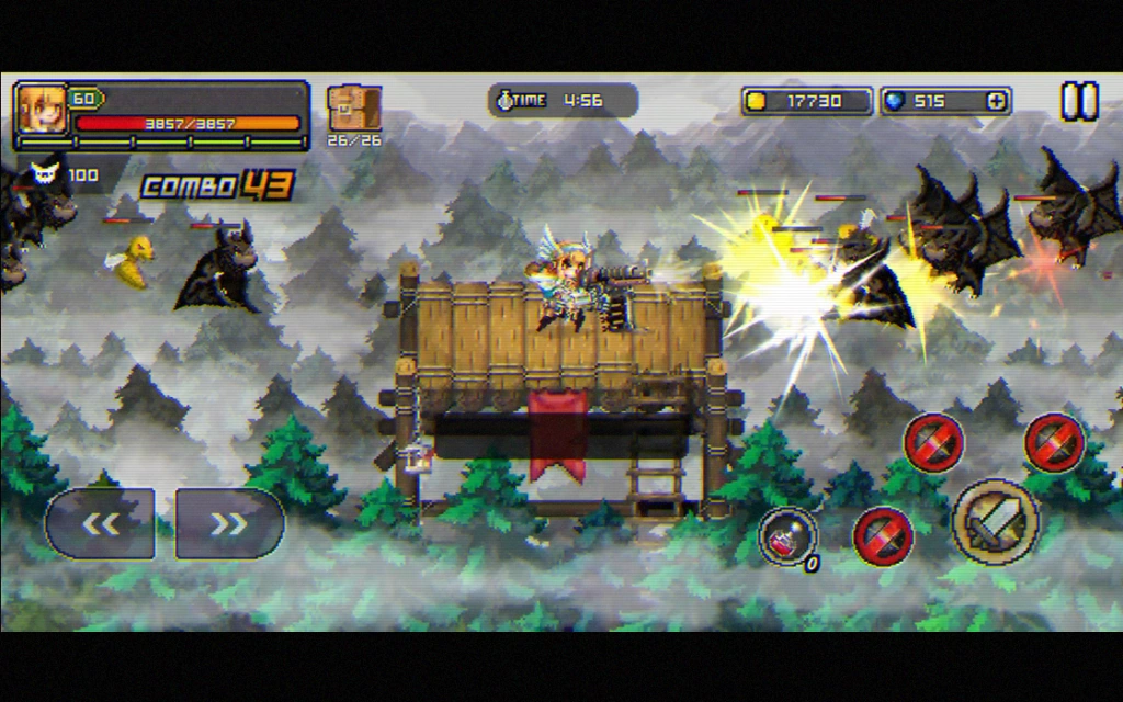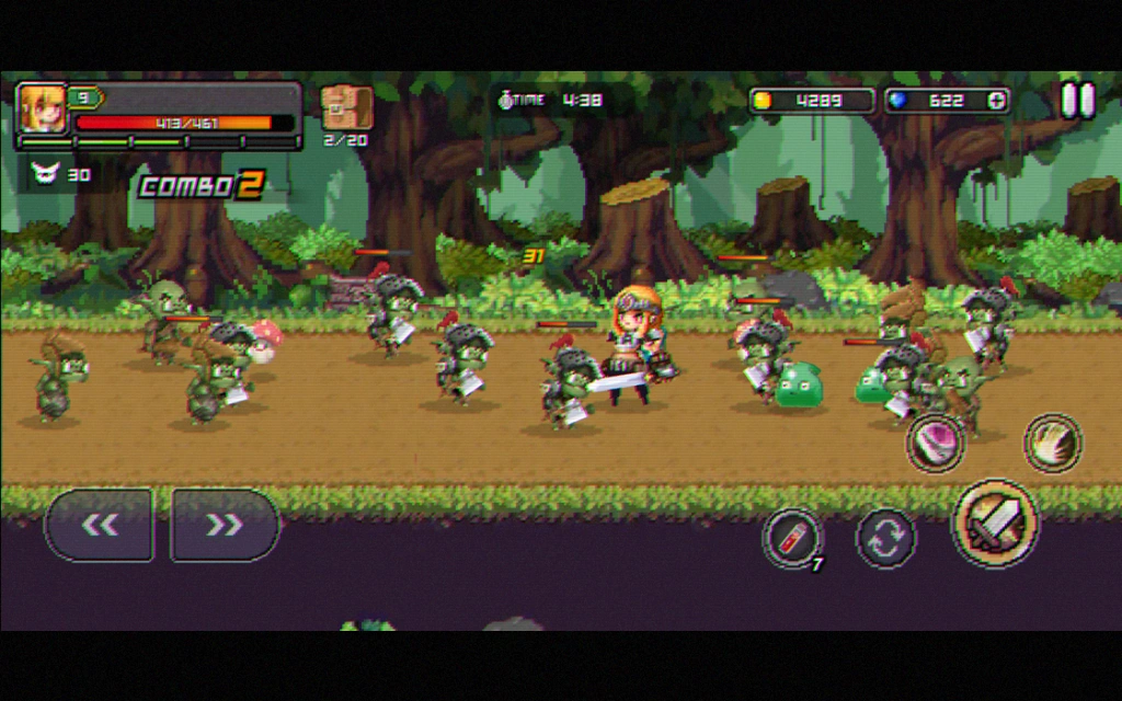 Just holding down the button will keep you attacking. Use combination attacks to swiftly defeat foes.