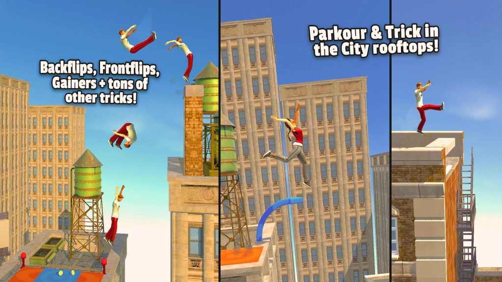 Use physics-based controls to spin and trick your way across rooftops, forests, and lakes. Perform a plethora of crazy tricks, including backflips, frontflips, gainers, twists, inverses, and more.