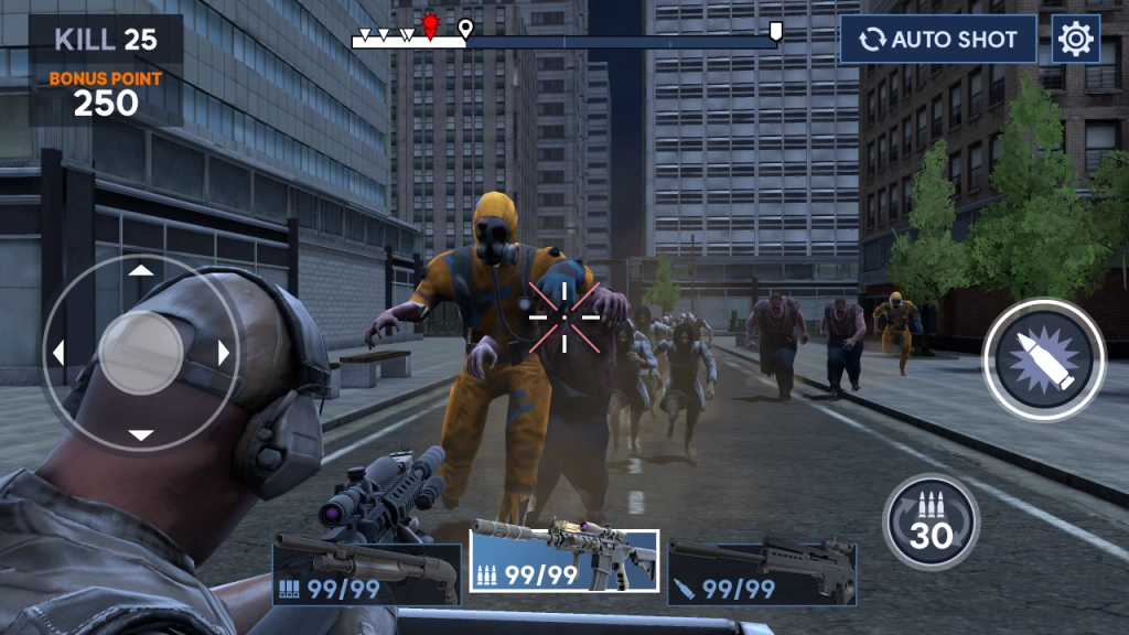 Intense gunfights and hunting adventures await you. Play through numerous levels, complete with boss fights and timed tasks, while pursuing wild boars, deer, and zombies with a selection of lethal firearms.