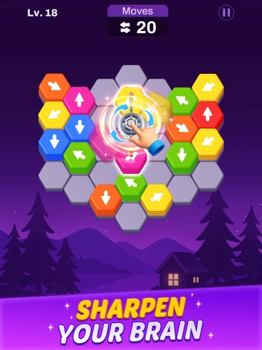 Using the arrows on the hexagon tiles, you must tap and clear them to progress in this color hexa puzzle game.