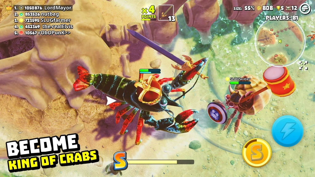 Battle with up to 100 real players in each game for intense multiplayer fun. Become the King of Crabs by scavenging, slaughtering, and scraping.