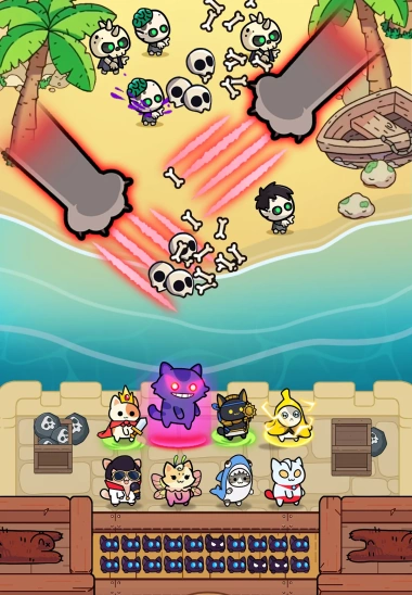 Raise the level of one-of-a-kind feline heroes and unleash their claws, water, and sand powers to defeat sea creature enemies.