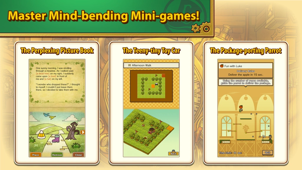 Fan-favorite riddles given new life with stunning visuals. Joining a continuation of Professor Layton’s quest, these challenging puzzles were created by puzzle expert Akira Tago. High-definition backdrops and animation were also included!