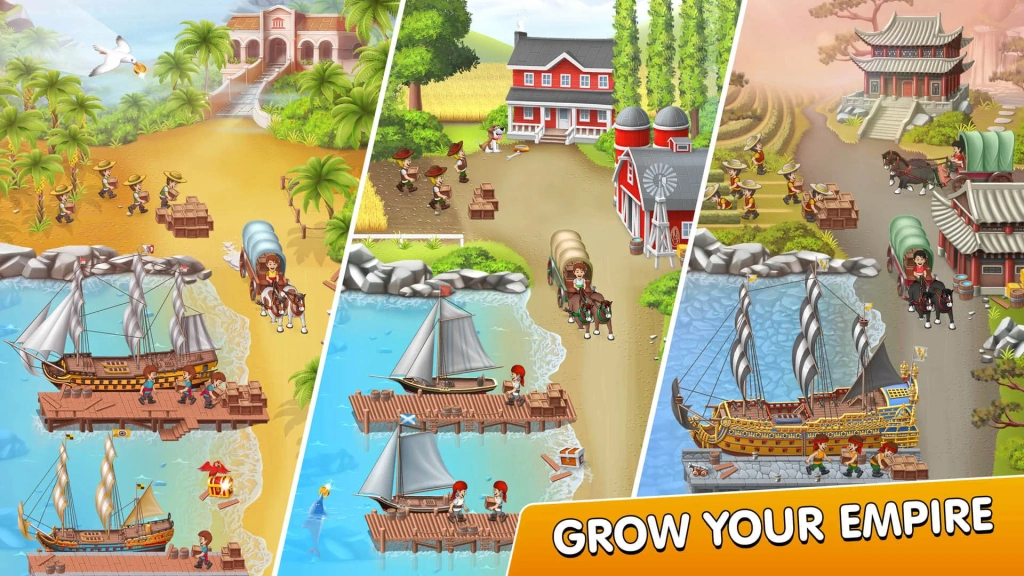 Play for fame and incredible gem rewards by joining leagues. Combine items to improve your farmers, wagons, and ships’ boosts. Play minigames to push yourself. Your ships’ sails and hulls can be painted however you like. Gain stars through upgrades.