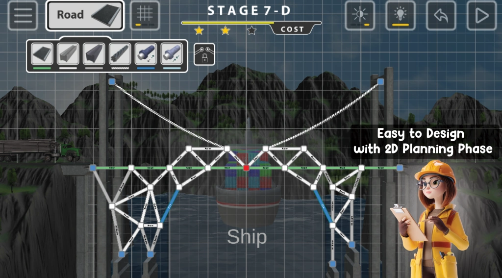 You may choose a 2D version of the game during the planning stage, which is simpler for bridge design. When you test the bridge, the game will switch to 3D mode so you can see how your design works.