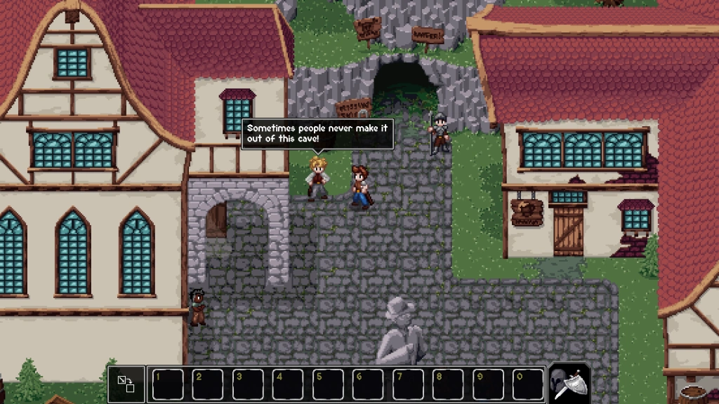 - Stores to purchase, sell, and enchant equipment in the middle of the cave.
