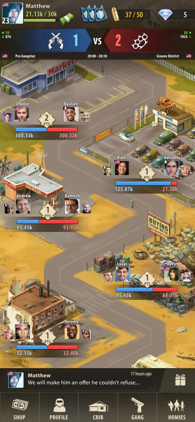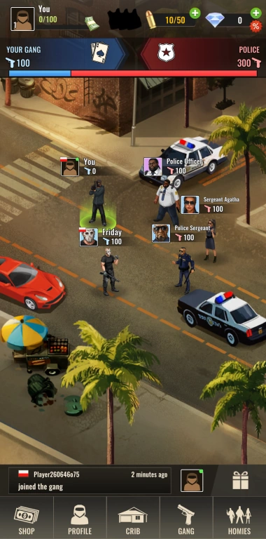 Join or form gangs with other players. Fight rival gangs that are run by actual players all over the world. Expand your territory and take control of neighborhoods. In competitive PvP action, climb the leaderboards. In critical situations, send backup to your crew.