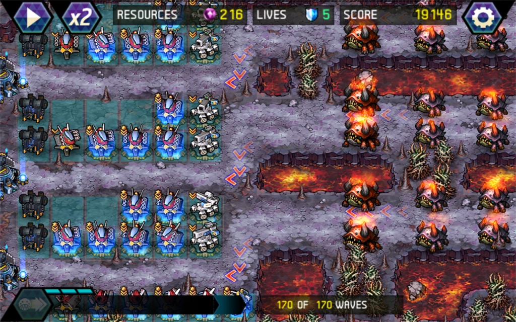 Enemies will move along a preset path, with the exception of some stages, and you must set up towers to stop them. You gain resources with every enemy you defeat, which you can use to construct or improve towers to fend off more formidable foes.