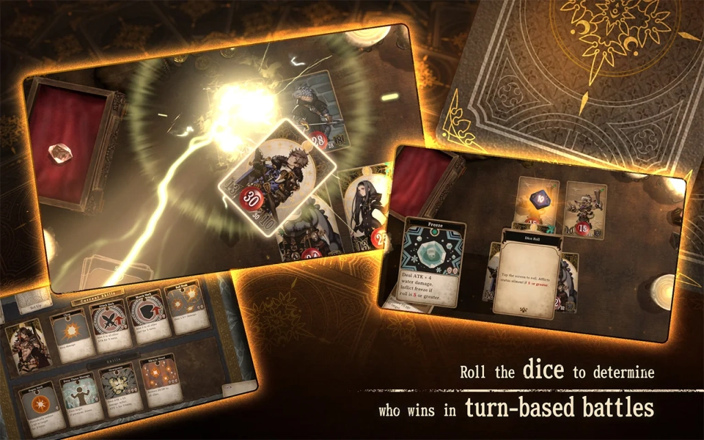 Gems, an item awarded every turn and used to unleash talents, are crucial to success in the turn-based fights. Another action that might decide your destiny is rolling the dice, which can deal additional damage or inflict status conditions.