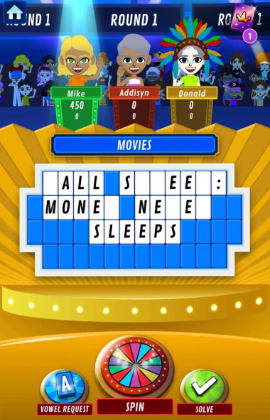 You must spin the wheel of luck, select the vowels and consonants you want, and win as many points as you can in each game in order to accomplish this. Take care not to end up in the bankruptcy cell.