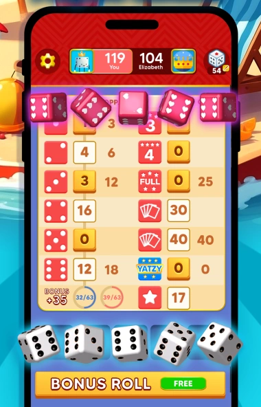 Score combinations: Yahtzee, Full House, and Straights. Every category is used just once, so every decision counts. Bonus rounds keep you suspenseful.