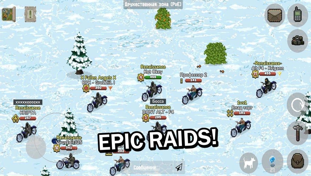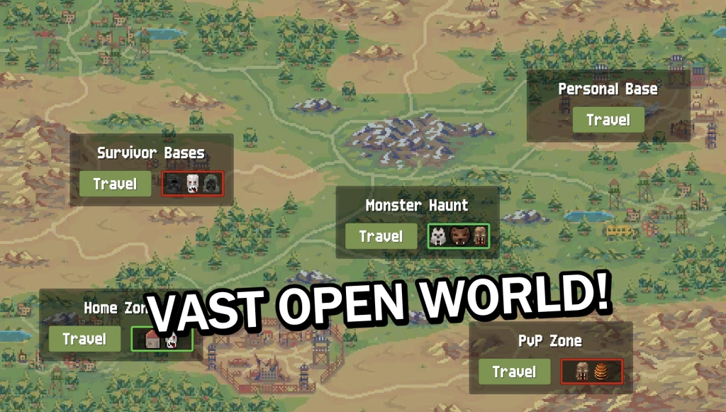 A vibrant, pixel-art massively multiplayer online role-playing game that combines elements of strategy, survival, and real-time fighting with the addition of both human players and mutant monsters.